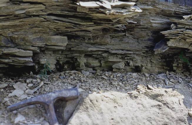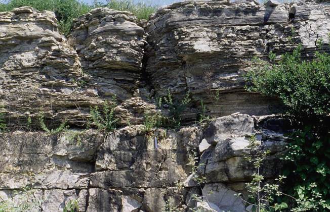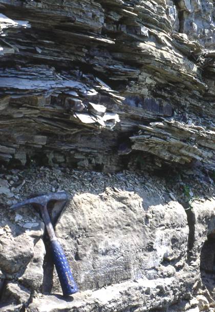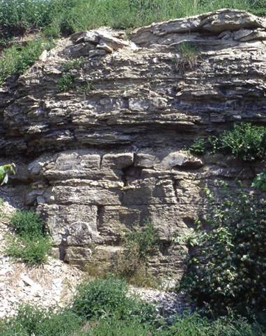 The thin-bedded limestones in the upper part of the cut represent the lowermost