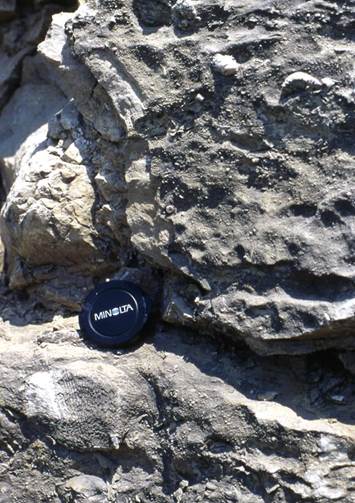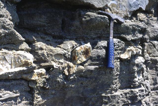 mudstone with lenses of mostly silicified fossil hash. Fossils include