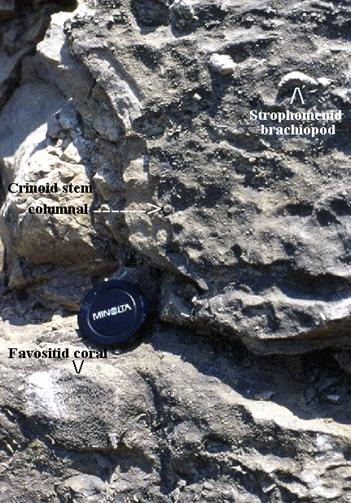 favositid corals, rugose corals, spiriferid brachipod shells, crinoid stems,