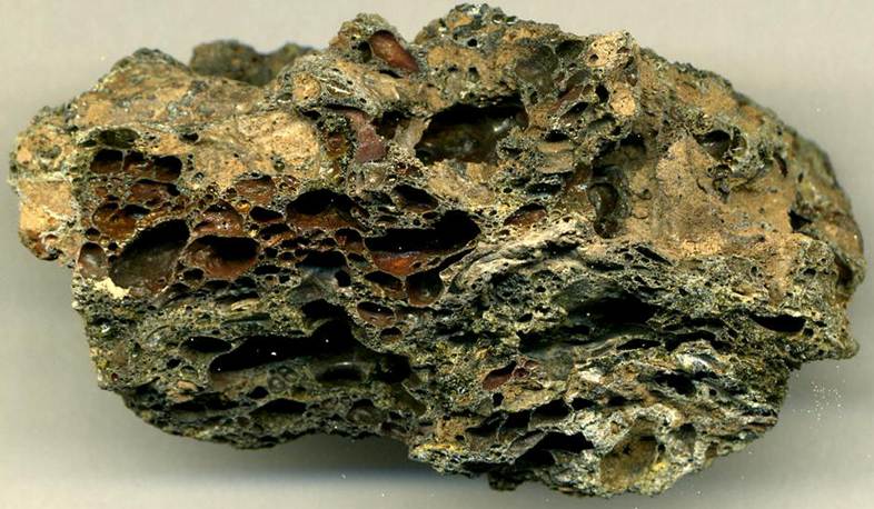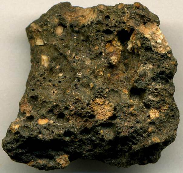Lonar Impactite (1.7 cm across) from Maharashtra State, India. This scoria-looking rock is the result of a Late Pleistocene impact in Maharashtra State, India. The impact occurred at about 52 ky. The Lonar Crater is ~1.1 miles in diameter and is filled with water (Lonar Lake). The target bedrock consists of Cretaceous-Tertiary aged flood basalts - the famous Deccan Traps. The texture and chemistry of Lonar Impactite samples show that the original solid basalt has been converted to a frothy, glassy-like material. If I didn't know where this came from, I'd swear it was scoria from a cinder cone.