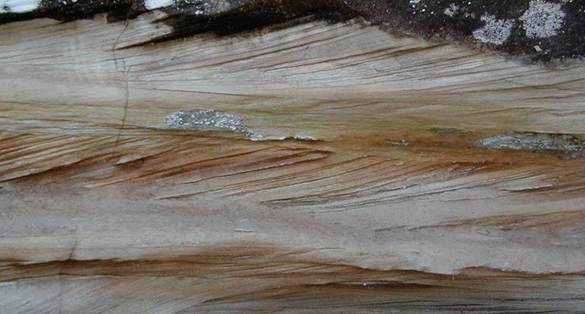 Cross bedding in tilted quartzose sandstones of the Dakota Group (Albian Stage, upper Lower Cretaceous) at Dinosaur Ridge, west of Denver, Colorado, USA.