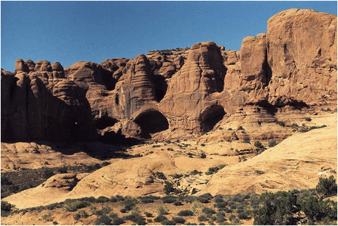 Blind arches developed at the contact between Slick Rock Member sandstones (above)