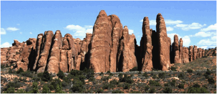 Sandstone fin at Park Avenue. The solid sandstone cliffs are Slick Rock Member