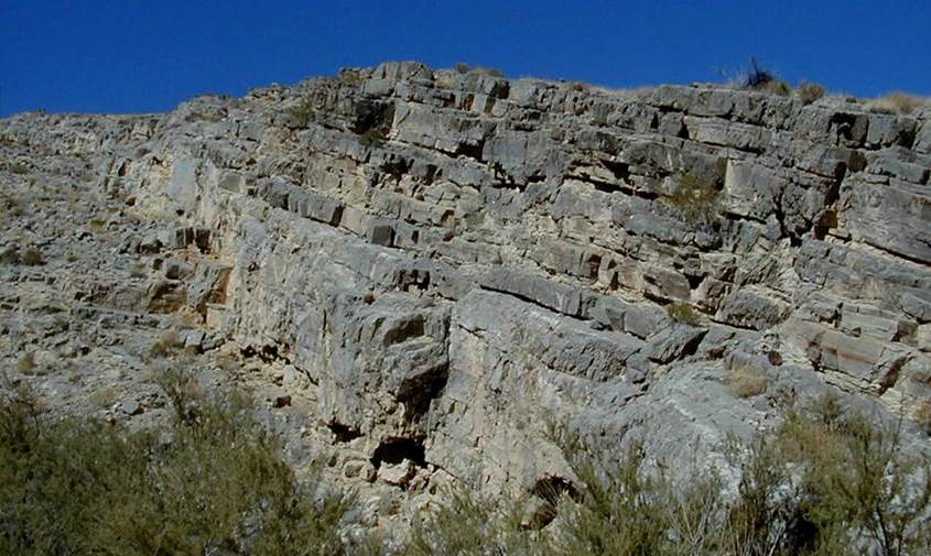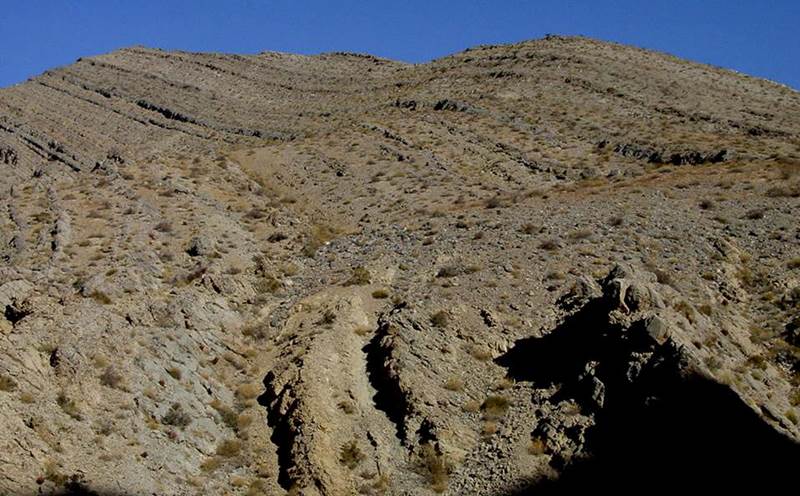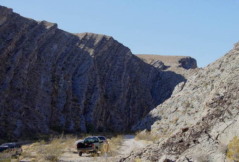 Eastward-dipping beds of the Bullion Limestone exposed in Arrow Canyon’s