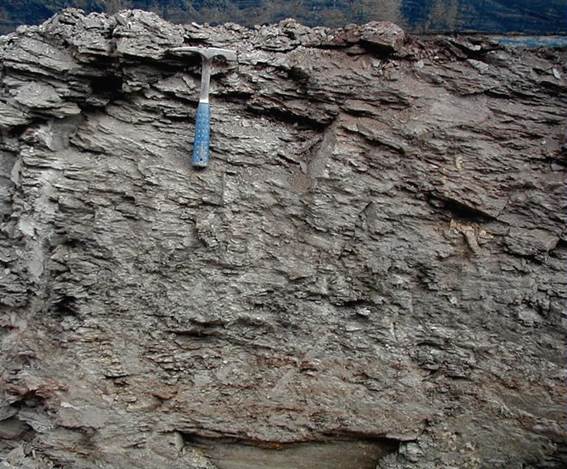 typically a grayish and reddish, soft clayshale succession, which weathers and