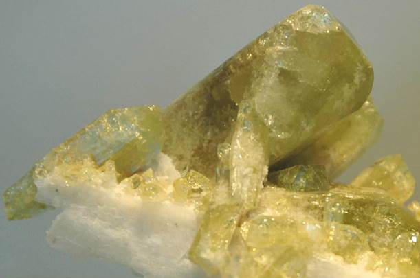 Brazilianite (olive green) & albite feldspar (white) from the Telirio Mine,