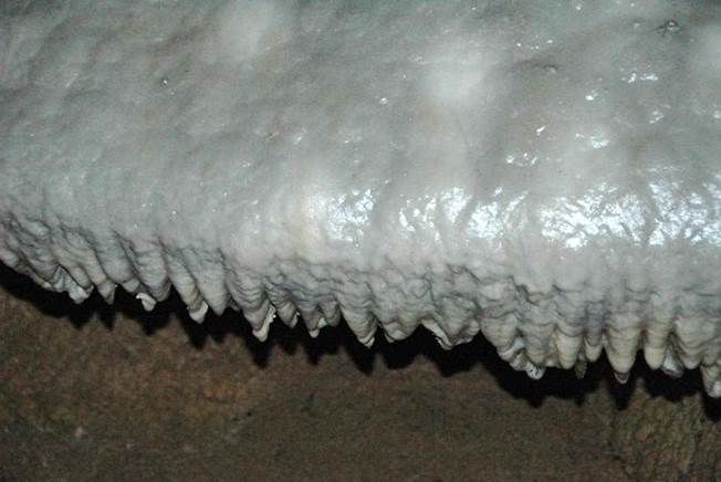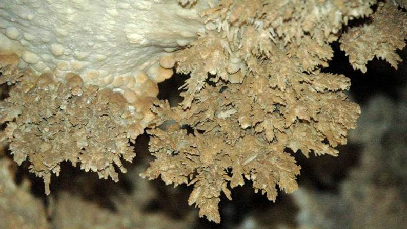 frostwork forms by evaporation of water slowly seeping from cave walls or