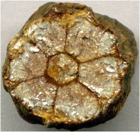 subhexagonal-shaped masses of fine-grained muscovite mica that show a