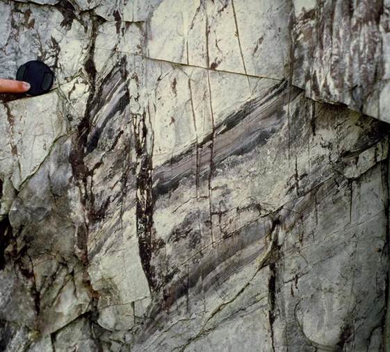 faulted beds of slaty metadolostone (lens cap for scale). Marquette South