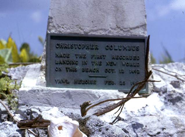 plaque reads: “On this spot Christopher Columbus first set foot upon the soil