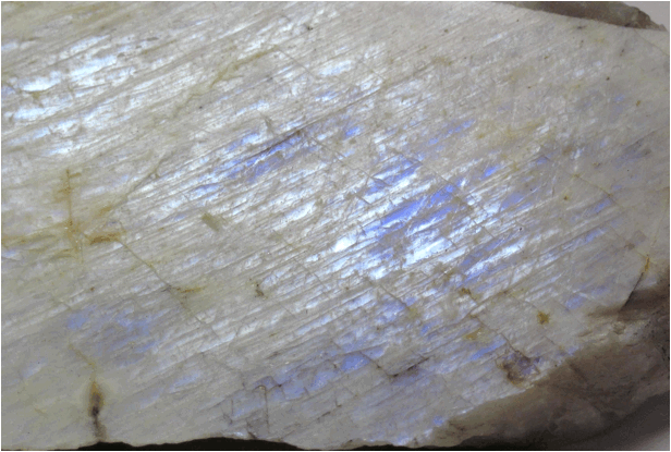 between the intergrown feldspars, resulting in bluish-white iridescence.