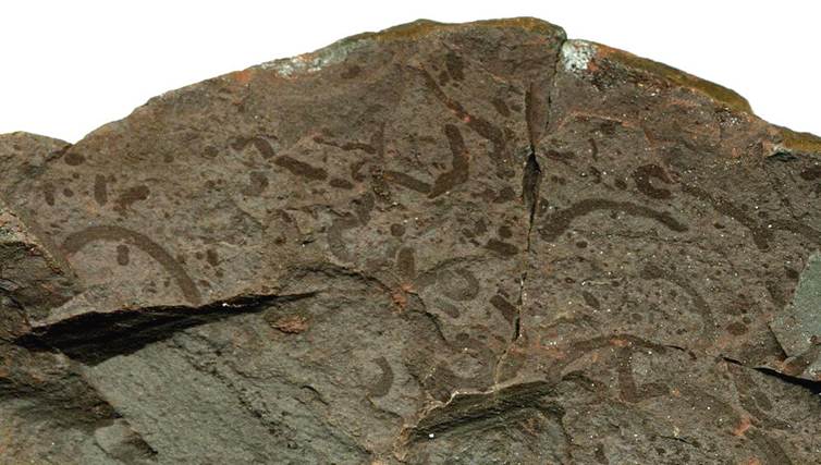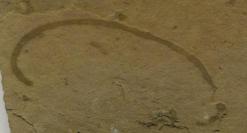 Grypania spiralis from the 2.11 b.y. (or 1.874 b.y.) Negaunee Iron-Formation at the Empire Mine, Negaunee, Upper Peninsula of Michiga, USA (FMNH PP 45972, Field Museum of Natural History, Chicago, Illinois, USA).