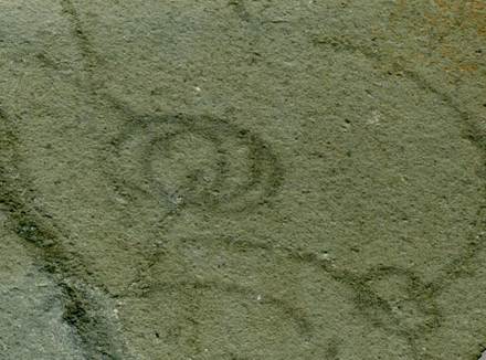 Grypania spiralis ribbon on taconitic mudshale, 2.5 cm across at its widest. Ribbon is ~0.6 mm wide.