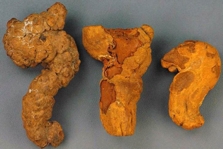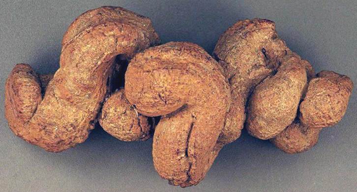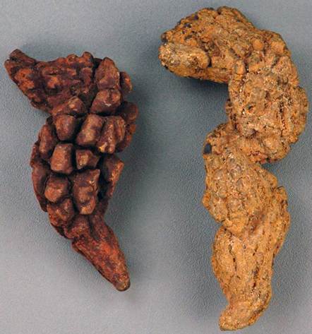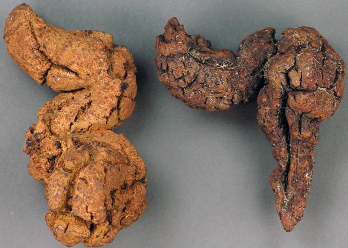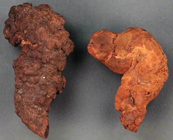 The paradoxical situation of abundant cololites and no bones & teeth was explained by Seilacher et al. (2001): the cololites were sideritized by bacterial activity and diagenesis involving moving groundwater fronts that favored dissolution of phosphatic material (bones, teeth) & precipitation of iron carbonate.