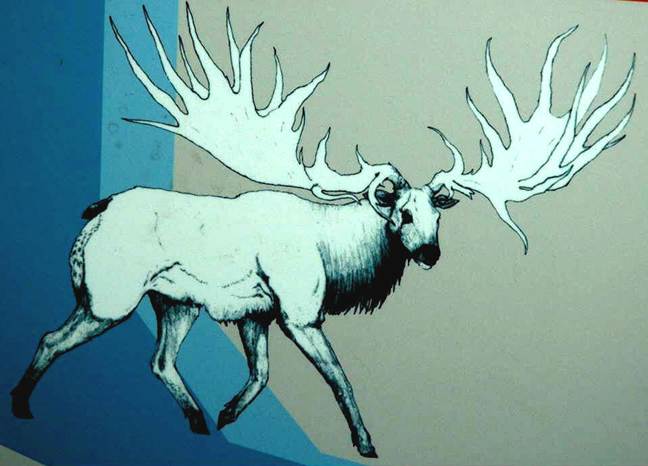 The famous Irish elk, or Megaloceros giganteus (Blumenbach, 1799), was a large, late Cenozoic deer that had enormous antlers. The species is well represented by numerous fossils found in Ireland. Its geographic range extended from northwestern Europe to northern Africa to eastern Asia. Its temporal range extends from the Pliocene to the Pleistocene to the early Holocene.