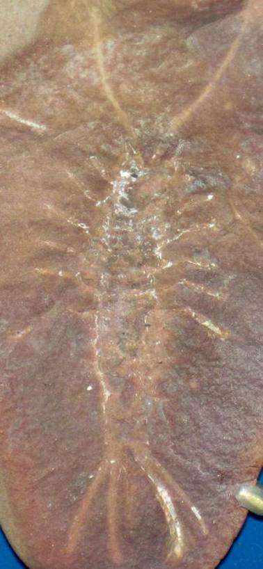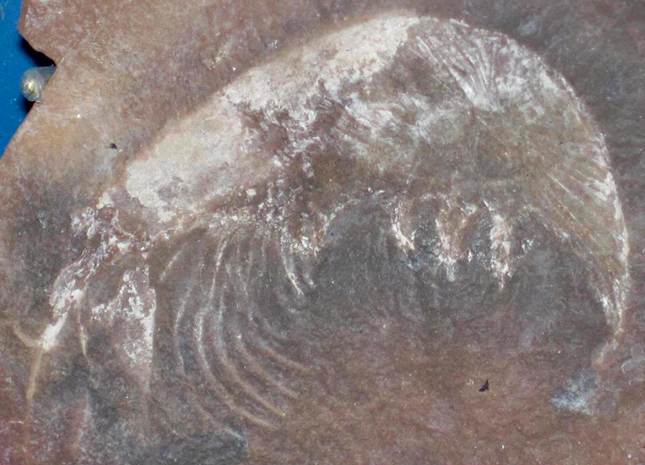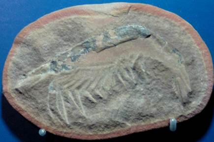 Belotelson magister Packard, 1886 - laterally compressed fossil shrimp in concretion from the Mazon Creek Lagerstätte (Middle Pennsylvanian) of Illinois, USA (FMNH PE 45648, Field Museum of Natural History, Chicago, Illinois, USA).