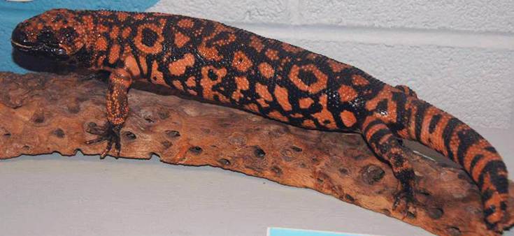 Heloderma suspectum Cope, 1869 - Gila monster (mount, Cleveland Museum of Natural History, Cleveland, Ohio, USA). This medium-sized, brightly-colored, lethargic lizard is venomous, and uses its venom to kill prey during the act of feeding. Biologist observations have shown that Gila monsters spend considerable time underground. It is predatory on small animals and vertebrate eggs.