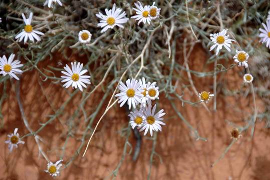 Erigeron divergens Torrey & Gray, 1841 - spreading fleabane (Plantae, Angiospermophyta, Asterales, Asteraceae/Compositae) near Double Arch, Arches National Park, eastern Utah, USA. This plant is a member of the daisy/sunflower family (Asteraceae), the second-largest group of angiosperms in the world, with >23,000 described species. The spreading fleabane has many dull green-colored stems with small, narrow to moderately narrow, elongated leaves. The flower consists of a small, yellowish, central disk surrounded by narrow, elongated, whitish petals. Erigeron divergens occurs in a variety of open habitats in Mexico, western America, and southwestern Canada.