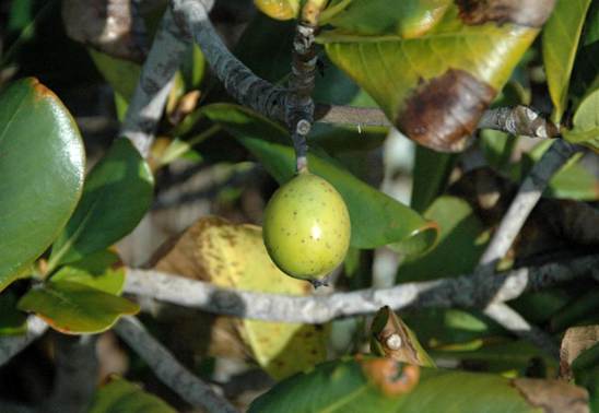 Casasia clusiifolia (Jacquin, 1797) (above & below) - seven year apple (Plantae, Angiospermophyta, Rubiales, Rubiaceae) on North Point Peninsula, northeastern San Salvador Island, eastern Bahamas. This shrub-like tree occurs along marine shorelines in Florida and in the Caribbean. Such environments are prone to drought and saltwater spray, especially during storms. Casasia clusiifolia is quite tolerant of such conditions. The leaves are distinctive in being elongated, glossy, relatively thick, and being laterally curled downward (see below). The “apple” fruits are slightly elongated, subspherical structures (see above). The fruits change color as they ripen over a year, from greenish to yellowish to brownish to blackish.