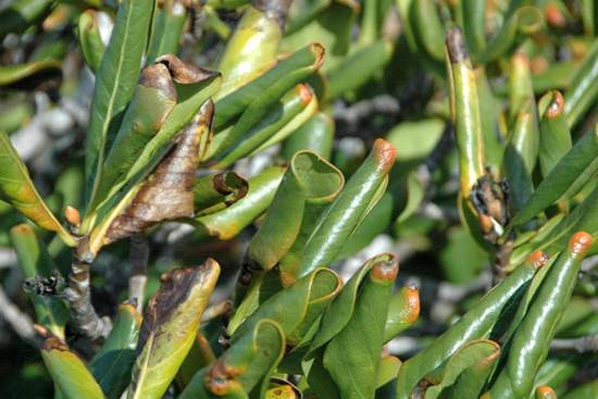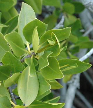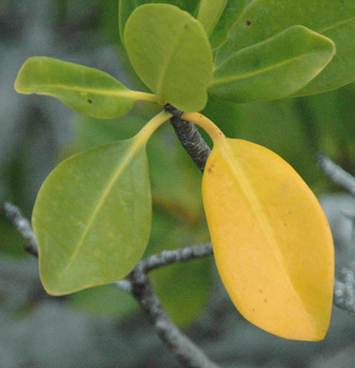 Rhizophora mangle Linnaeus, 1753 - leaves of the red mangrove. The yellow leaf is a “kidney leaf” (see explanation above), where the plant concentrates unneeded salt.