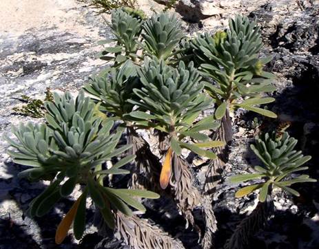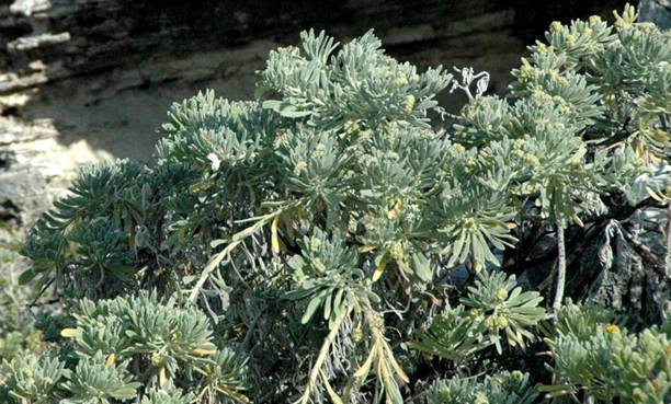 Tournefortia gnaphalodes (Linnaeus, 1759) (above & below) - bay lavender/sea lavender/sea rosemary (Plantae, Angiospermophyta, Lamiales, Boraginaceae) on North Point Peninsula, northeastern San Salvador Island, eastern Bahamas. This two to six feet-high perennial shrub grows in full sun in marine coastal dune and thicket environments. Leaves are relatively slender, elongated, succulent (fleshy), and grayish-green in color. This plant is tolerant of drought and occasional saltwater spray. It occurs in Bermuda, along some Gulf of Mexico coasts, and along some Caribbean coasts.