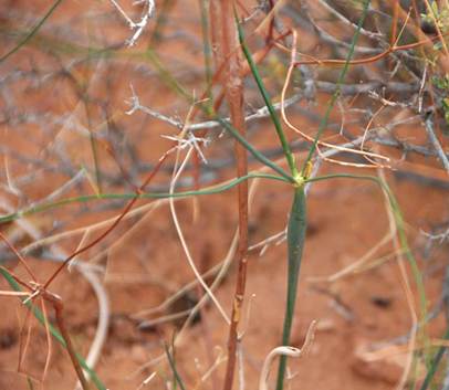 Eriogonum inflatum Torrey & Frémont in Frémont, 1845 - desert trumpet (Plantae, Angiospermophyta, Polygonales, Polygonaceae) in Park Avenue, Arches National Park, eastern Utah, USA. The desert trumpet is a distinctive member of the buckwheat family - it’s a perennial herb with naked, dull-green stems noticeably inflated below the bases of several, very slender branches. Flowers are small and yellowish. Leaves occur close to the ground, surrounding the base of the stem. Eriogonum inflatum occurs on sandy and rocky desert substrates in the desert southwestern USA and northwestern Mexico.
