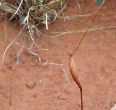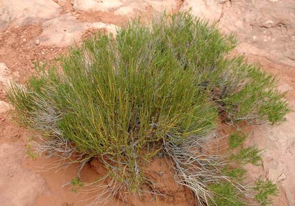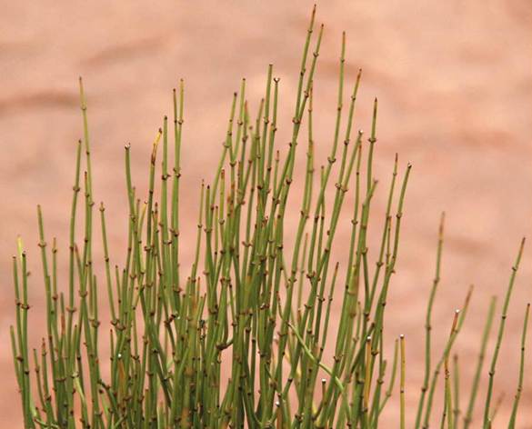 Ephedra (above & below) - Mormon tea (Plantae, Chlamydospermae, Gnetales) from Park Avenue, Arches National Park, eastern Utah, USA. Ephedra is one of a few plants that defy traditional plant classification. Botanists generally consider it to be an odd gymnosperm or “transitional” between gymnosperms and angiosperms. The high-level taxon “Chlamydospermae” has been established for this and a few other forms. Ephedra is a medium-sized shrub having many stiff, upright to semi-upright, essentially bare branches with regularly spaced nodes. Tiny and scale-like leaves occur at the nodes along the branches. There are between 30 and 40 living species of Ephedra. Species identification generally requires very close examination. It prefers pebbly or sandy soil in cool desert settings. Ephedra is known from many desert environments in the New Wold and much of the Old World.