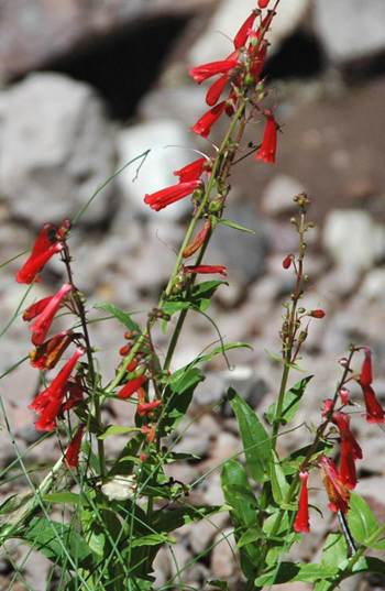 Penstemon eatonii Gray, 1872 - firecracker beardtongue (Plantae, Angiospermophyta, Scrophulariales, Scrophulariaceae) in Deer Creek Canyon, Marysvale Volcanic Field, southwestern Utah, USA. This relatively small plant occurs in mountainous desert settings of southwestern & western America. Leaves are elongated, ~rounded proximally, and taper distally. A series of scarlet-colored, drooping, somewhat long, tubular flowers occur along the flowering stalk.