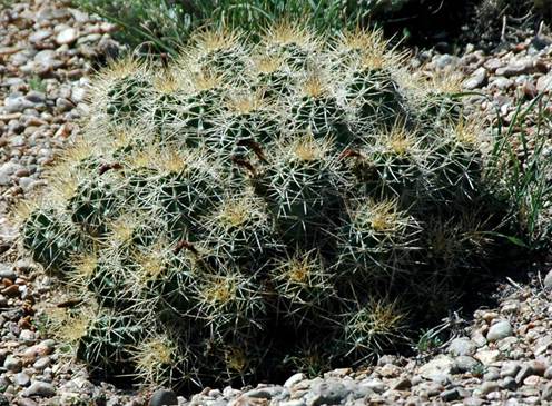 Echinocereus triglochidiatus Engelmann in Wislizenus, 1848 - claret-cup cactus (Plantae, Angiospermophyta, Caryophyllales, Cactaceae) near Cleveland-Lloyd Dinosaur Quarry, east-central Utah, USA. The clasts of the pebbly substrate upon which this specimen is growing are derived from a polymict conglomerate unit - the Buckhorn Conglomerate Member of the Cedar Mountain Formation (Lower Cretaceous). Claret-cup cactus occurs in hot, rocky, desert settings of southwestern America & northern Mexico. The flowers are intensely scarlet, sitting on top of stumpy, cylindrical, highly spinose stems. Like other cactuses, this plant lives in arid environments and has features that conserve water. The spiny, green, stumpy stems of cactuses are photosynthetic. The leaves of cactuses have evolved into spines.