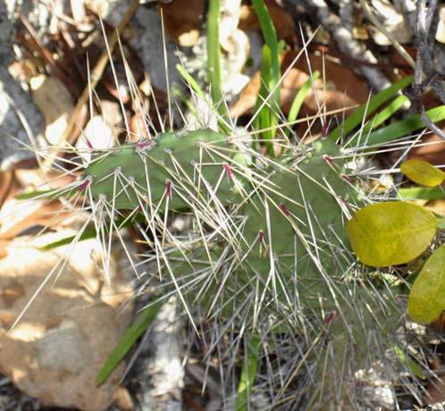 Opuntia dillenii (Ker Gawler, 1818) (above & below) - common prickly-pear cactus (Plantae, Angiospermophyta, Caryophyllales, Cactaceae). Opuntia cactuses consist of upright stacks of fleshy, subcircular to elongated segments covered with long, slender, sharp spines. This species’ natural distribution is Caribbean-area islands, Florida, and Mexico.