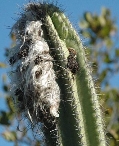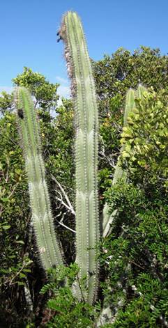 Pilosocereus royenii (Linnaeus, 1753) - bearded cactus (Plantae, Angiospermophyta, Caryophyllales, Cactaceae) near Garden Cave (above left) and at Crescent Pond (above right), northeastern San Salvador Island, eastern Bahamas. This large cactus consists of tall, upright, fleshy stems having prominent, axis-parallel longitudinal ridges bearing clusters of radiating spines. A tuft of long, whitish hair occurs on one side near the top - the “beard”. If moisture/dew form on the hairs, the water drips downward, near the plant's roots. This is an evolutionary adaptation to living in an arid climate. The bearded cactus only occurs on Caribbean islands and in Central America’s Yucatan Peninsula.