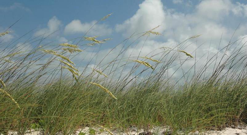 Uniola paniculata Linnaeus, 1753 - sea oats (Plantae, Angiospermophyta, Poales, Poaceae) along the southern shore of Graham’s Harbour, northern margin of San Salvador Island, eastern Bahamas. This is a common, tall grass in subtropical, vegetated back-beach facies along the eastern and Gulf of Mexico coasts of America, Mexico, and on Caribbean islands. As such, it is tolerant of saline conditions (sea spray). It’s root systems are deep and extensive, resulting in well-stabilized back-beach sediment surfaces.