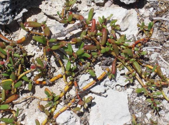 Sesuvium portulacastrum (Linnaeus, 1753) - sea purslane (Plantae, Angiospermophyta, Caryophyllales, Aizoaceae) at Green Cay, western Graham’s Harbour, offshore from northwestern San Salvador Island, eastern Bahamas. This low-growing, runner-type land plant has greenish- to reddish-colored, elongated-ovoid, thick, fleshy leaves. It near-globally distributed along tropical and subtropical coastlines.