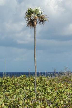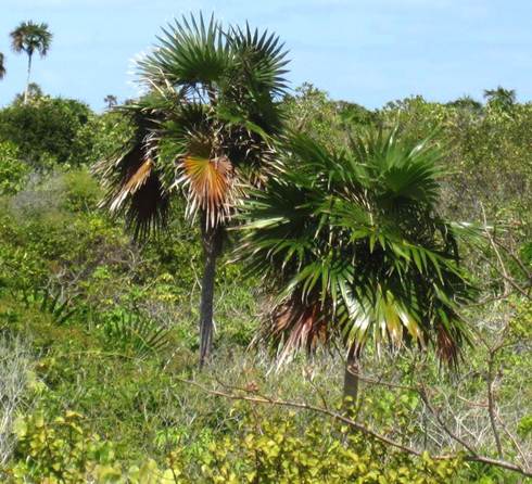 Coccothrinax argentata (Jacquin, 1801) - silver thatch palms (Plantae, Angiospermophyta, Arecales, Arecaceae/Palmae). Above left: near Sandy Point, southwestern corner of San Salvador Island, eastern Bahamas. Above right: near Sand Dollar Beach and Rocky Point, northwestern corner of San Salvador Island, eastern Bahamas.
