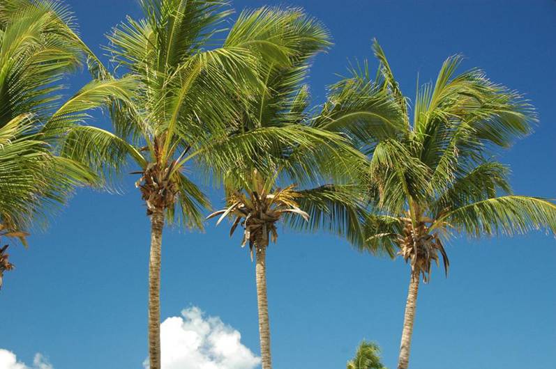 Coconut trees consist have moderate thick, mostly subcylindrical, linear to curvilinear, upright to tilted trunks. The crown consists of several, very long, highly segmented leaf blades. Leaf blade segments arise from a very prominent midrib. Coconuts are the fruit of this tree. They are large, irregularly rounded, and green to yellowish-brown to brown in color, depending on the degree of ripeness.