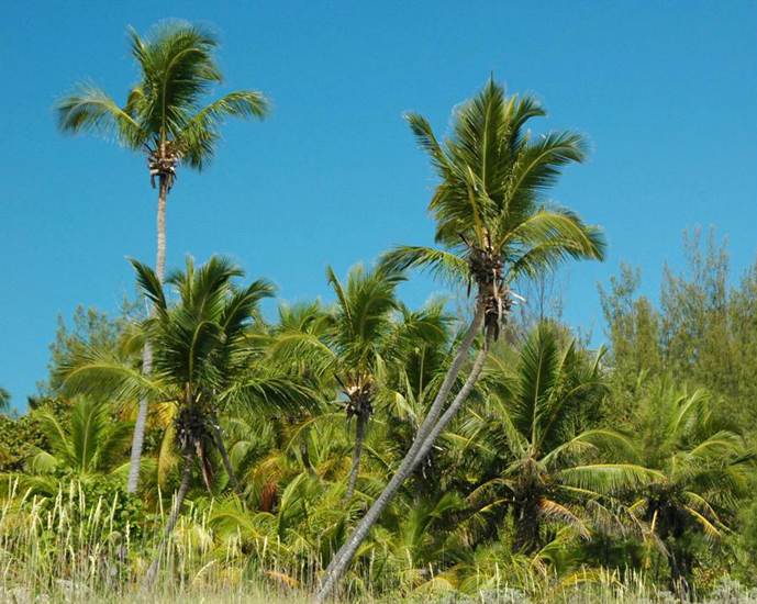 Cocos nucifera Linnaeus, 1753 (above & below) - coconut palms (Plantae, Angiospermophyta, Arecales, Arecaceae/Palmae) just south of North Twin Coves Cliffs, north-central Eleuthera Island, east-central Bahamas. Coconuts are only produced by this species of palm tree. Coconut palm trees are widespread along and near most tropical to subtropical, Old World and New World and Oceanic coastlines. They appear to have originated in the western and southwestern Pacific. The Bahamian examples shown above & below are not native to the Bahamas - they were introduced to the Caribbean area by Europeans four to five centuries ago.