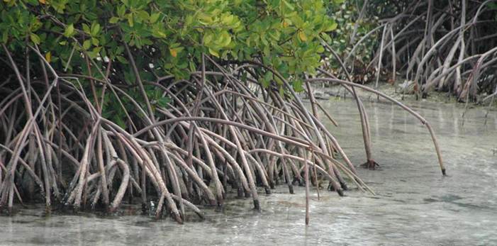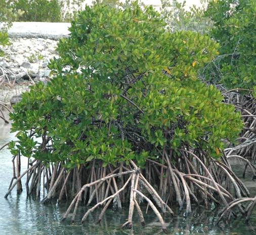 The red mangrove principally lives in sheltered estuaries with its roots in and often submerged by marine water. Most angiosperms cannot tolerate such saline conditions. The plant’s vascular tissues transport nutrients and water throughout the plant, as do all vascular plants. The transported water is, of course, quite salty. This salt is not needed by the organism. The red mangrove concentrates the salt into a few leaves, which turn yellow (see below). Eventually, the yellow, salt-rich leaf detaches and falls into the water. These leaves essentially act as kidneys for the whole plant.