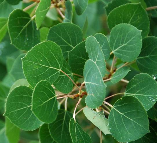 Populus tremuloides Michaux, 1803 - quaking aspen (Plantae, Angiospermophyta, Malpighiales, Salicaceae) in Rocky Mountains National Park, northern Colorado, USA. Quaking aspens are subalpine trees in the mountainous terrains of western North America. The common name “quaking” refers to the shaking or fluttering of the tree’s leaves in breezes. In this species, the petiole (= “stem” leading to a leaf) is flattened. The flattened surface catches even slight air movements, resulting in the leaves “trembling” or “quaking”. This plant principally propagates by spreading out lateral root systems. Entire groves of quaking aspens have been found to have identical DNA fingerprints - they're all “twins”, or “clones” of each other.
