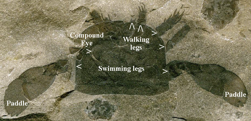 Eurypterus remipes DeKay, 1825 - closeup of head (prosoma) showing four walking appendages (labeled below) and swimming appendages with paddles at distal ends (7.5 cm across).