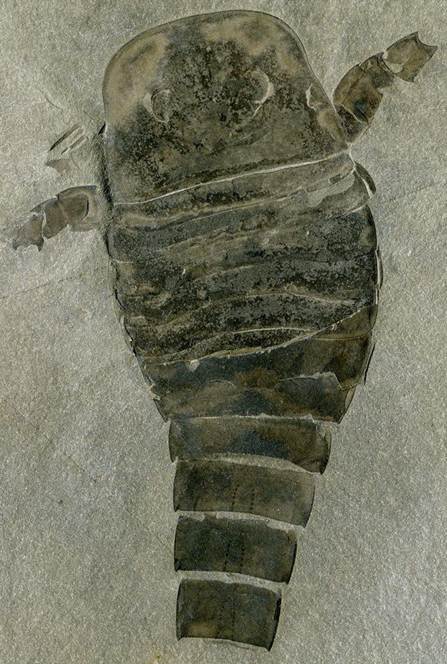 Eurypterus remipes DeKay, 1825 partial specimen (12.5 cm long) in fine-grained dolostone, lacking paddles (distal ends of swimming appendages), pretelson & telson (posterior end of the body). The last four segments are part of the postabdomen. The seven segments anterior to that make up the preabdomen.