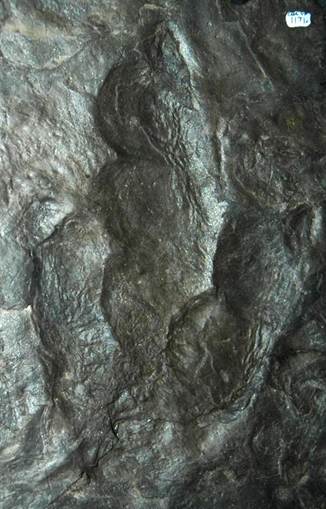 Anchisauripus exsertus (Lull, 1904) (left) theropod dinosaur footprint from the Connecticut River Valley of eastern America (CMC public display - Cincinnati Museum of Natural History & Science, Cincinnati, Ohio, USA).