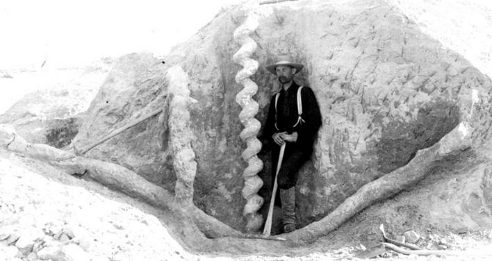 Below: vintage field photo of excavated Daemonelix burrows in a Harrison Formation paleosol in what is now Agate Fossil Beds National Monument (original photo: University of Nebraska; photo provided here courtesy of Agate Fossil Beds National Monument).