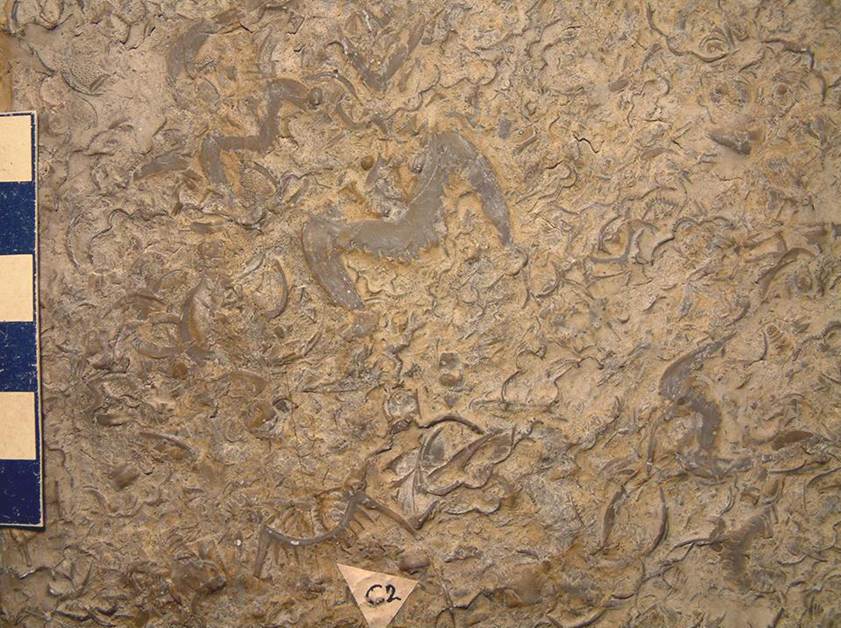 Drepanura premesnili pygidium (2.9 cm across at its widest) - this trilobite pygidium (tail) is in a fossiliferous wackestone from the Kushan Formation (~uppermost Middle Cambrian) of Shandong Province, northeastern China. Kushan limestones contain a relatively diverse trilobite fauna. The most distinctive trilobite in Kushan rocks is Drepanura premesnili Bergeron, 1899 (Arthropoda, Trilobita, Polymerida, Damesellidae). The pygidia of Drepanura have strikingly large anterolateral spines. When portions of the pygidia are covered in matrix, these Drepanura tails resemble flying bats (see below) - hence “batstones”.