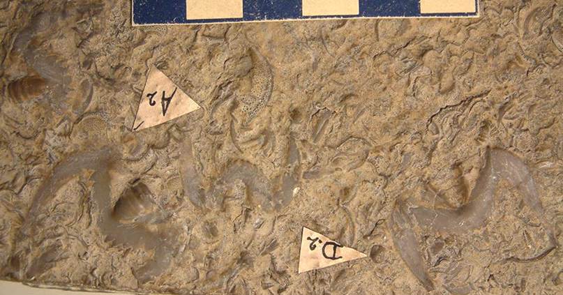 Drepanura premesnili tails dominate the surfaces of these Kushan Formation batstones from Shandong, China.