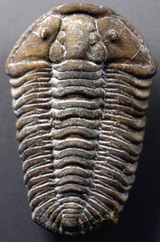 Gravicalymene abbreviata (3.8 cm long) from the Kope Formation (Edenian Stage, lower Cincinnatian Series, Upper Ordovician) of southern Brown County, Ohio, USA. Specimen collected by Mark Peter.