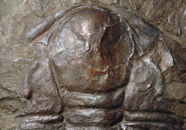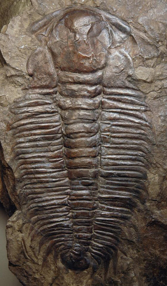 Paradoxides minor (Boeck, 1828) cranidium attached to thorax (width of cranidium at posterior end of palpebral lobes: 5.1 cm across) from the Jince Formation (Middle Cambrian) of Jince, Bohemia.