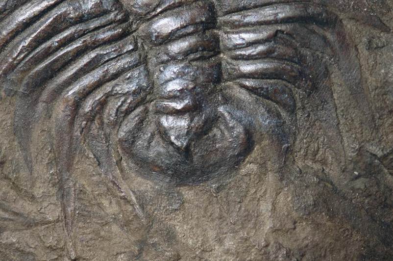 Paradoxides minor (Boeck, 1828) pygidium attached to thorax (tail is 1.6 cm across) from the Jince Formation (Middle Cambrian) of Jince, Bohemia.