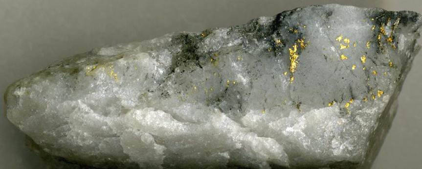 Cadillac Gold Ore (3.8 cm across) - this is a hydrothermal quartz-gold vein from the Precambrian of Cadillac in southwestern Quebec, Canada. In this sample, native gold is emplaced only in fractures in the quartz. The gold blebs you see at center & at right are lining a fracture that's been split (you're facing the plane of the fracture). Published research on Cadillac auriferous quartz veins indicates that most of the gold there is along late-stage fracture faces. Quartz veins in this area intrude Archean rocks (Cadillac Group & Pontiac Group turbiditic continental shelf type sediments & Piche Group mafic and ultramafic volcanics)