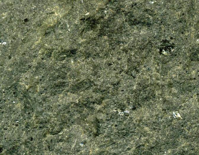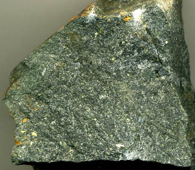 The second rock is a ugandite from the Indaiá II Intrusion. This rock is a finely-crystalline alkalic hypabyssal intrusive having relatively small olivine phenocrysts set in a groundmass of diopside clinopyroxene, phlogopite mica, spinel, perovskite, nepheline, and glass.