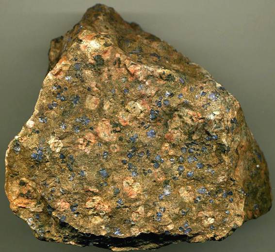 Llanite (9.5 cm across) from the Precambrian of Texas. It’s a porphyritic rhyolite with phenocrysts of quartz (dark blue) and perthitic feldspar (light grayish-orangish). The brown material surrounding the phenocrysts is very finely crystalline quartz-feldspar-biotite.